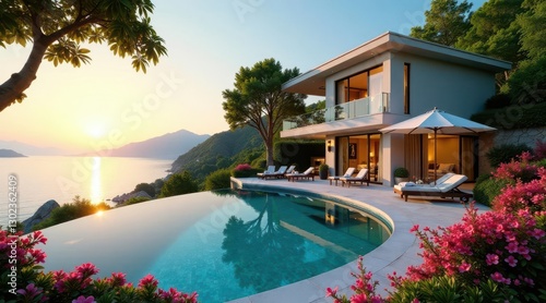 Obraz premium Luxury Waterfront Villa with Infinity Pool and Sunset Views