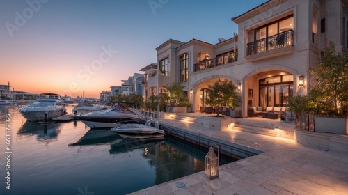 © Tanu, Fototapeta premium Luxury waterfront villa with yachts at sunset in a serene marina setting