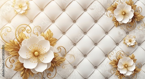 Obraz premium Luxury white leather texture background with golden flowers and leaves