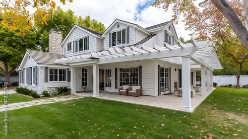 © RAKSIWAH, Obraz premium Luxury White Suburban Home Exterior with Pergola Patio and Lush Lawn