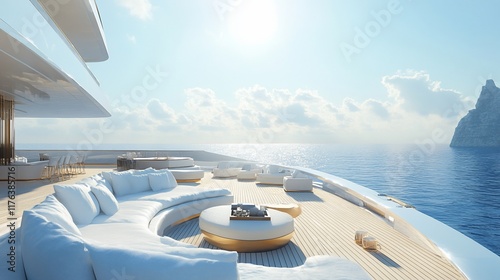 Fototapeta premium Luxury yacht deck with seating, ocean view.