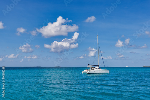 © icemanphotos, Naklejka premium Luxury yacht in open waters with beautiful clouds. Catamaran white sailboat in tropical ocean lagoon, sea horizon under sunny skyline. Idyllic outdoor sport and travel recreation landscape, seascape