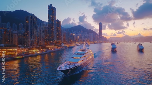 Naklejka premium Luxury yacht sailing through Hong Kong harbor at sunset with city skyline