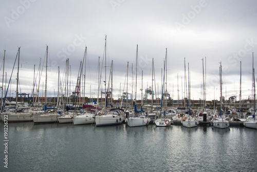 Fototapeta premium Luxury Yachts And Boats In Valencia Port At Mediterranean Sea. Reflexion in the water. White yachts are in the Spanish port of Valencia in the beginning of spring. Cloudy sky.