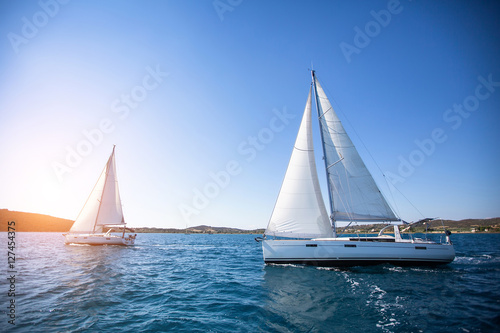 Fototapeta premium Luxury yachts at Regatta. Sailing in the wind through the waves at the Sea.