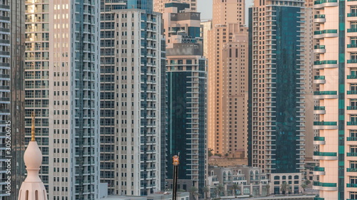 Obraz premium Luxury yachts parked on the pier in Dubai Marina bay with city aerial view timelapse