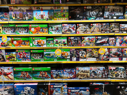 © AS Photo Family, Naklejka premium Lviv, Ukraine - February 16, 2025: Colorful shelf display featuring LEGO themed sets from various series and franchises