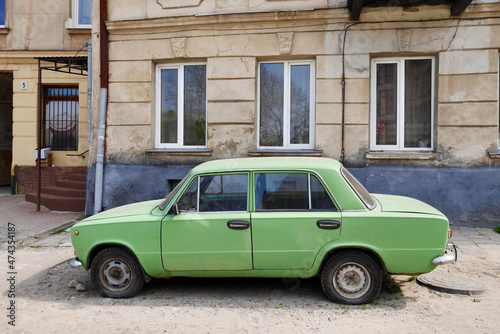 © Maleo Photography, Fototapeta premium Lviv, Ukraine, 8.04.2019. Green vintage car in the streets of Lviv.