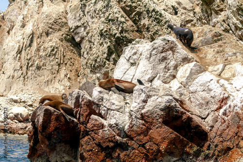 Naklejka premium Lwy morskie śpią w słońcu, podczas gdy jeden z nich wędruje wśród skał wysp Ballestas (Paracas, Peru)