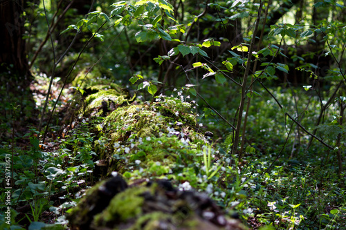 © PhotoChur, Fototapeta premium Lying in the forest trunk of an old tree overgrown with oxalis plant, forest background
