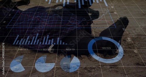 Naklejka premium Lying person wearing dark jacket, plaid shirt, boots on sandy ground, displaying translucent graphs