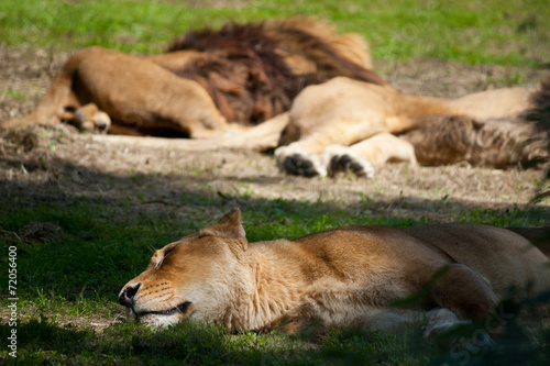 © Morgenstjerne, Fototapeta premium lying sleeping lion on green grass