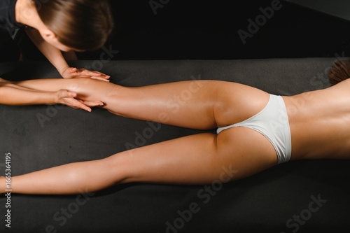 © Serhii, Obraz premium Lymphatic drainage massage of legs and lower legs. Female feet in the hands of a masseur