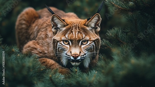 © Kasivat, Obraz premium Lynx Crouched in Dense Pine Forest Blending with Shadows