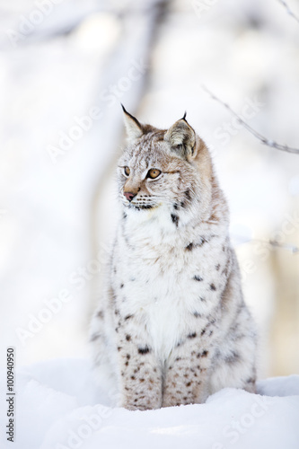 © kjekol, Naklejka premium Lynx cub sits in the cold snow