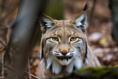 Obraz premium Lynx looks with predatory eyes from the shelter, hidden in the forest while...