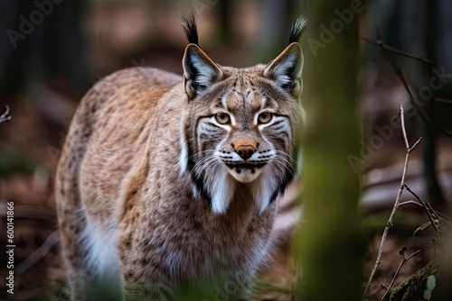 Obraz premium Lynx looks with predatory eyes from the shelter, hidden in the forest while walking
