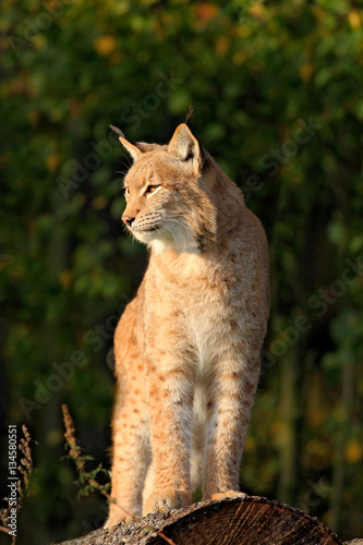 Naklejka premium Lynx on the tree trunk. Sitting wild cat Eurasian Lynx in orange autumn...