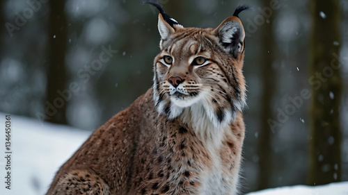 Obraz premium Lynx Portrait in Winter Snow Forest Looking to the Side
