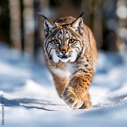© Tam, Fototapeta premium Lynx Prowls Through a Snowy Forest Environment Amidst Climate Change
