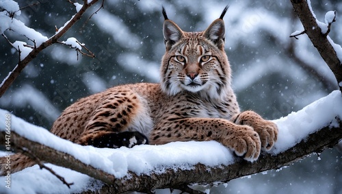 © Artem, Obraz premium Lynx resting on snowy branch during winter snowfall