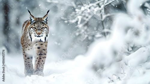 Fototapeta premium Lynx walking in the snow - Winter wildlife in Europe