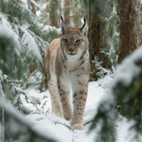 © DisplayGG, Fototapeta premium Lynx walking through snowy forest medium shot wildlife portrait