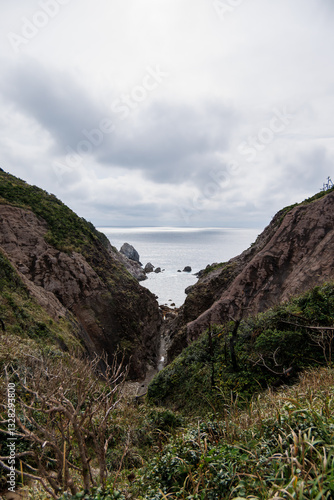 Naklejka premium 式根島の美しい海際露天風呂、地鉈温泉。 60mの断崖絶壁を降りてたどり着くワイルドな野湯である。 90度の源泉が小川となって潮溜まりに注ぎ込む。 海水と温泉が混ざって適温になった場所を探して入るシステム。東京都伊豆諸島式根島-2024