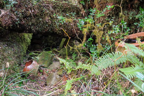 © d3_plus, Obraz premium 標高854mの八丈島最高峰、八丈富士の登山トレッキング。 八丈富士の山頂は大きなカルデラになっている。 ジャングルになっているカルデラ内部に降りてゆくことも可能。 中央には聖地の浅間神社があり、巨大なご神木や古びた鳥居、願掛けの岩などが置かれている。 願掛けは八丈島特有の海岸の丸石を広い、願いと名前を記入。山頂の社まで運ぶというもの。航路の終点、太平洋の大きな孤島、八丈島。 東京都伊豆諸島。