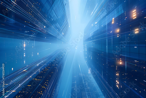 © A-photos, Obraz premium ガラス張りの高層ビルと光のラインが象徴する企業統合とM&Aコンセプト