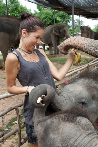 © Digitalpress, Obraz premium Mädchen füttert Elefanten