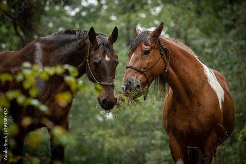 © Nadine Haase, Obraz premium Mädchen mit Pferden im regnerischen Wald