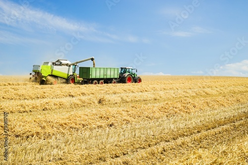 Obraz premium Mähdrescher, Schlepper mit Anhänger beim Getreide abfahren
