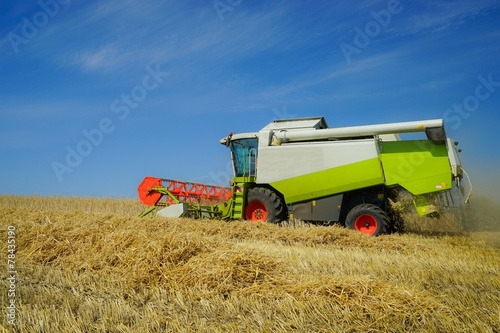 © Countrypixel, Fototapeta premium Mähdrescher von der Seite,bei der Ernte.