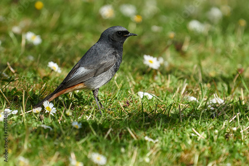Obraz premium Männlicher Hausrotschwanz auf der Futtersuche auf einer blühenden Frühlingswiese