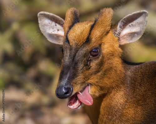 Obraz premium Männliches Muntjak mit herausgestreckter Zunge