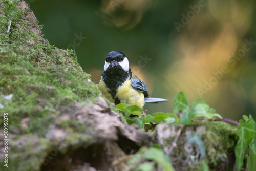 Obraz premium Mésange charbonnière dans la nature - bokeh vert et lumière chaude