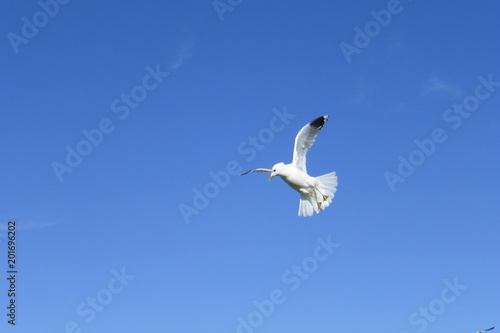 Obraz premium Möwe im Flug am blauen Himmel vor blauem Hintergrund am Meer
