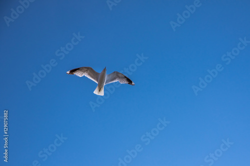 Obraz premium Möwe mit weißen Flügeln fliegt vor blauem Himmel