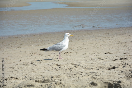 Fototapeta premium Möwe von der Seite steht auf Sandtrand