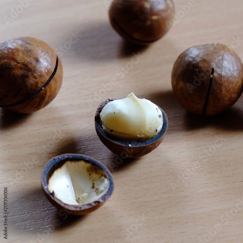 © Olexandr, Obraz premium Macadamia nuts in shell on wooden table