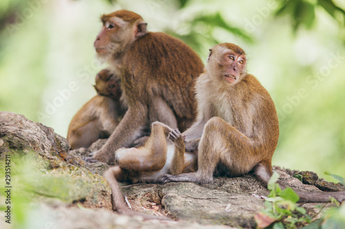 © belyaaa, Fototapeta premium Macaque family in the jungle, in Thailand.