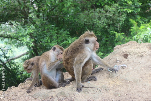 © SISIRA, Naklejka premium Macaque monkey family sitting together on a rock. Sri Lanka