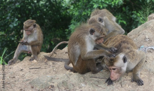 © SISIRA, Naklejka premium Macaque monkey family sitting together on a rock. Sri Lanka