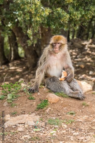 © icephotography, Obraz premium Macaque monkey sitting in the grass by a tree in Morocco close to Atlas Mountains