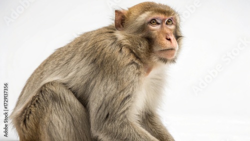 © Alper, Naklejka premium Macaque monkey with expressive face and soft fur sitting calmly on a clean white studio background, sharp focus, and professional studio lighting
