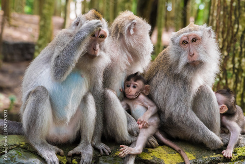 Naklejka premium Macaque monkeys with cubs at Monkey Forest, Bali, Indonesia