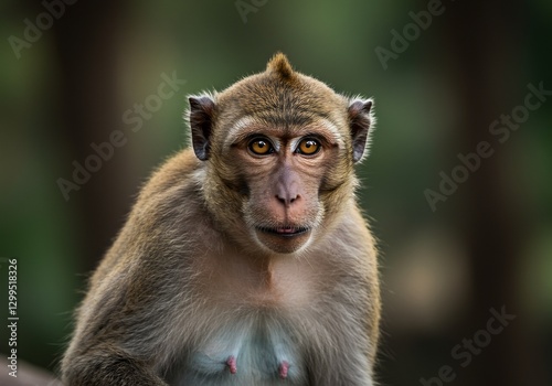 © Nathan, Fototapeta premium Macaque Stares with Amber Eyes in Blurred Forest