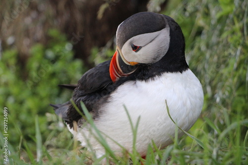 © Helne, Naklejka premium Macareux posé sur un rocher. Paysage sur la mer et l'oiseau sur son rocher. Macareux islande