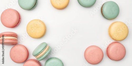 © nanthana, Obraz premium Macarons cake arranged in a falling pattern on a white background, top view with copy space, fly, isolated, dessert